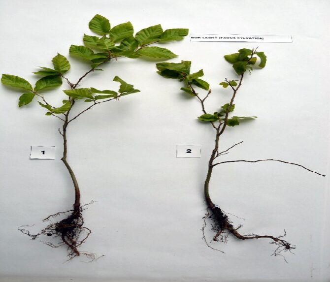 European beech (Fagus sylvatica), germination with HUMAC® Agro was 95-100% compared to 80% germination in the control group. The seedlings had a well-developed root system with many lateral roots and capillaries. The trunk was visibly thicker and the aerial part was larger with more leaves.